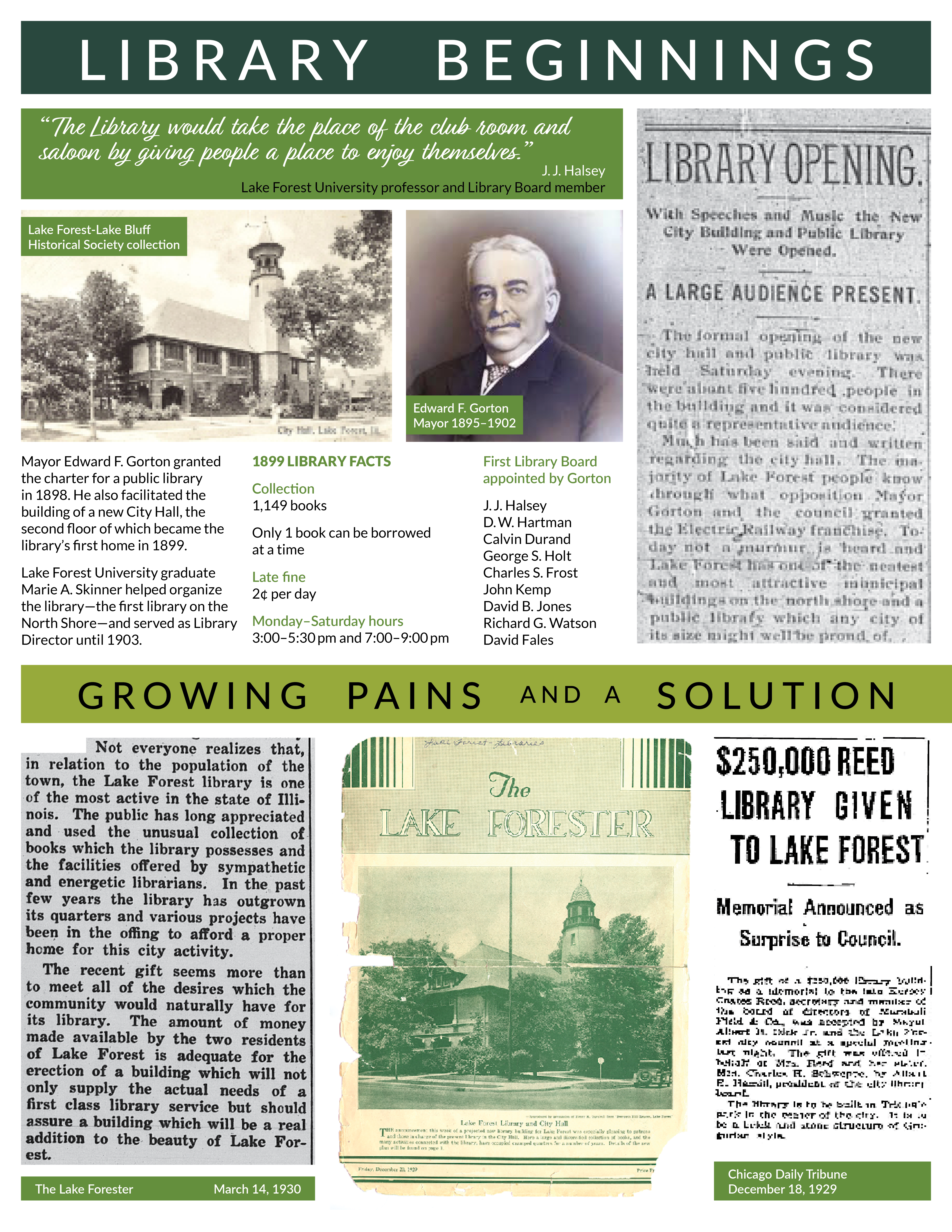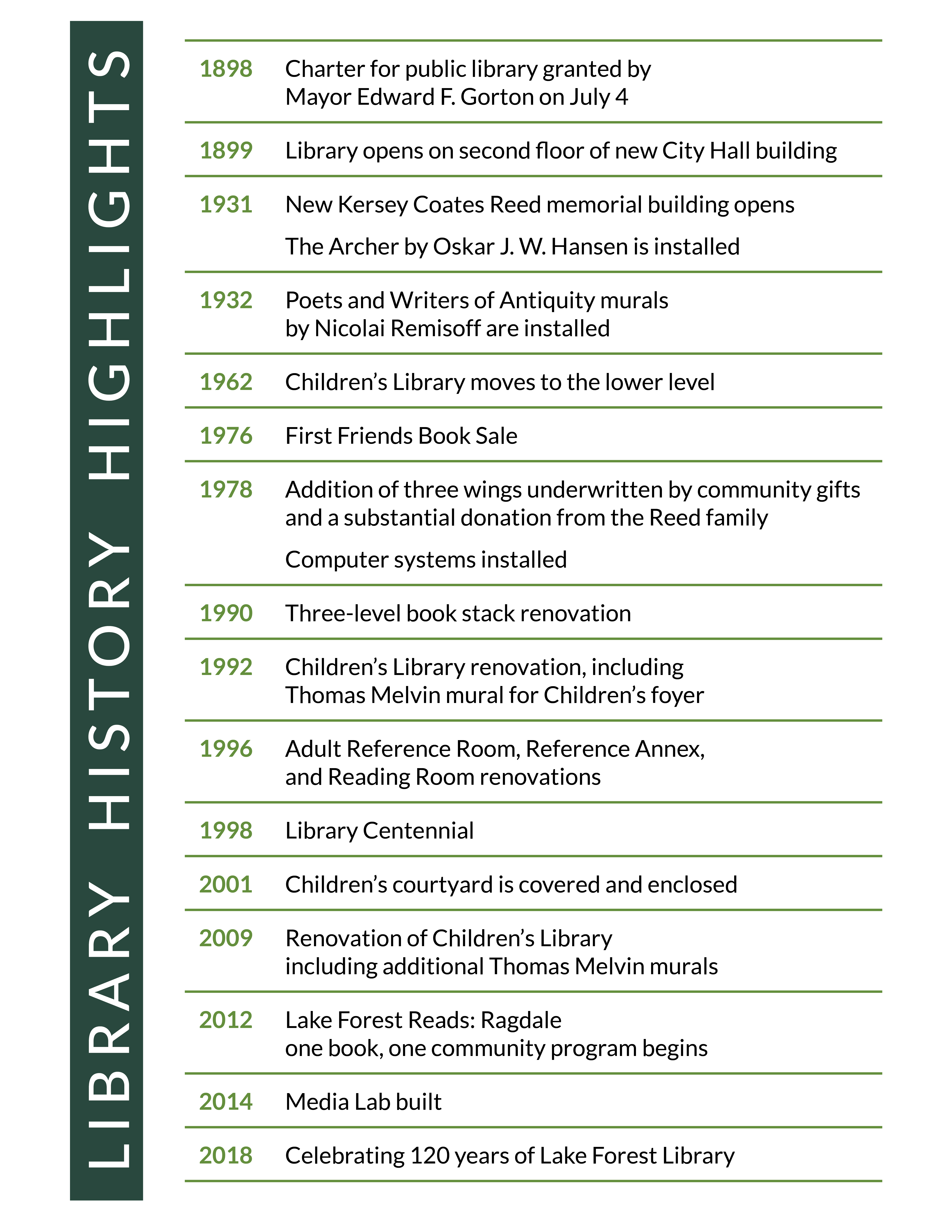 On July 4, 1898, Lake Forest Library was chartered by Mayor Gorton and City Council.