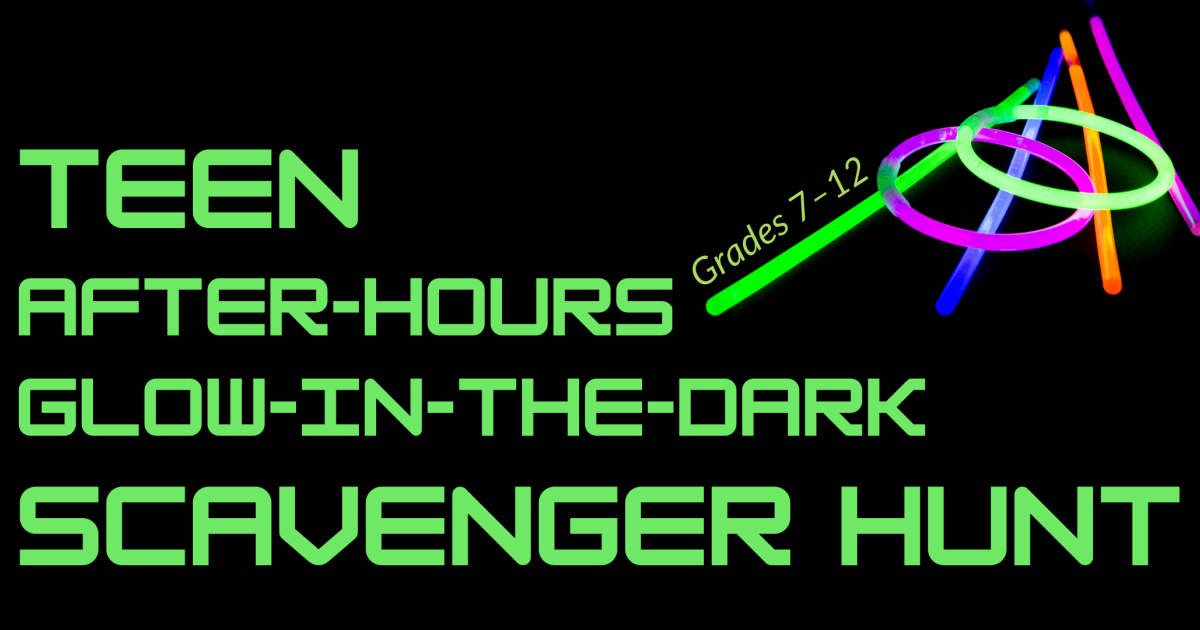 Register and join us in person for lights off at the Library as we divide into teams and hunt for hidden glow sticks. Winning team gets a prize!