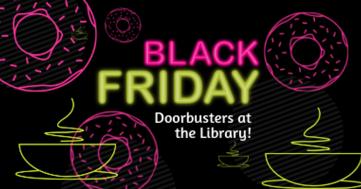 Whether you've already hit the shops or are headed that way, take a break with us at the Library. Enjoy donuts and coffee, make a card for a child in the hospital this holiday season, then take advantage of our Black Friday special: 50% off fines! (Excluding fines for missing or damaged items and subject to Library staff discretion.)