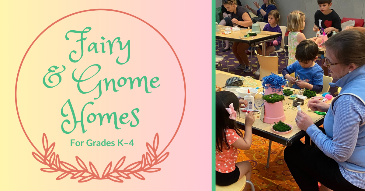 Register and join us in person to make an enchanting woodland dwelling to welcome your fairy and gnome friends this spring! Supplies are provided, but we encourage you to take a gnature walk with your caregiver before the program and gather any additional materials you may want to add to your garden home.
