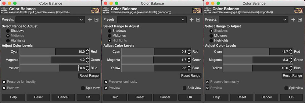 So, the main tool we're given is a set of 3 sliders that adjust levels for cyan/red, magenta/green and yellow/blue. They can be adjusted in context to shadows, midtones and highlights. Start with midtones, then go to the others.