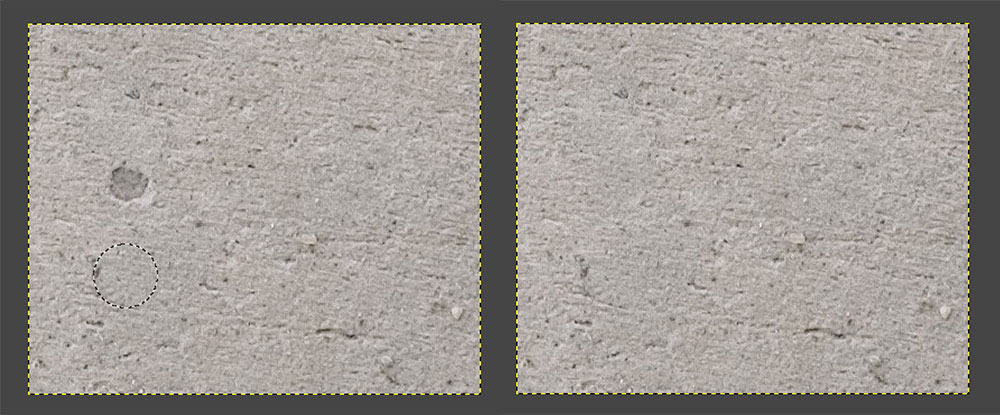 The Clone Stamp tool can be used to eliminate scratches and other type of image imperfections. Identify the problem area, and what portion of the image you'd like to duplicate. In this example, I've chosen an image of a wall made of cement. I will patch the larger hole with similar texture right below it. This is an easy fix.