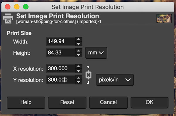 When changing resolution, Photoshop automatically adjusts the width/height. GIMP's option is a little more explicit with both horizontal and vertical resolutions rather than one value to account for both. To do this, ensure the circular link between the two resolution values is closed. Clicking on the link toggles it to be open/unlinked or closed/linked. If linked, changing the value for “X resolution” (width resolution) to 300 automatically updates “Y resolution” (height resolution) to be the same. This does not apply if you unlink the values. See image: