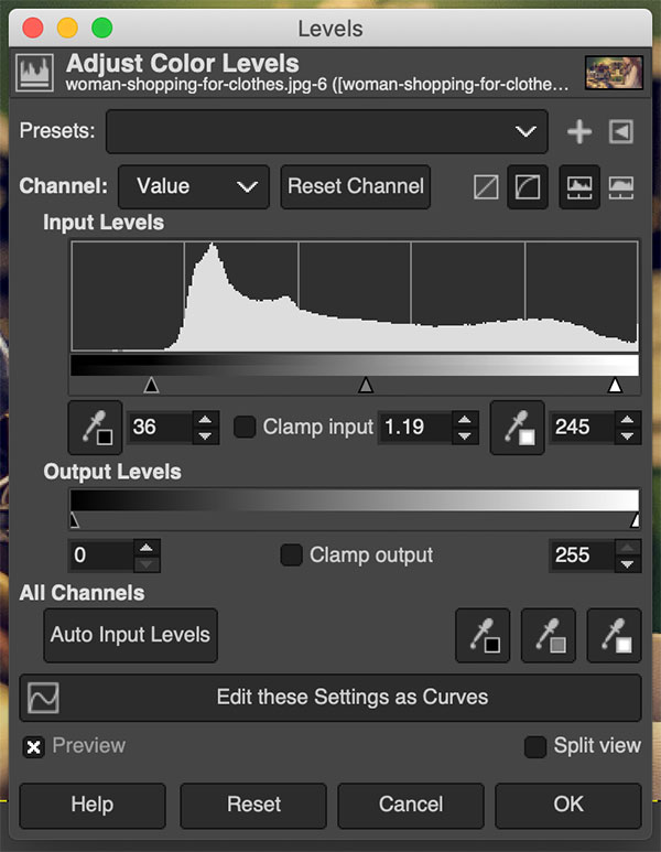 Adjusting levels in GIMP is a similar process to Photoshop. In Gimp, select: Colors > Levels. Focus on the graph, which has three marker arrows at the bottom. These help to produce a clearer image. The black arrow refers to the darker regions, gray for midtones, and white for the lighter sections. Align the black arrow where the curve begins its ascent, move the midtones slightly to the left, and move the white arrow slightly to the left. See the levels window and notice the difference in contrast.