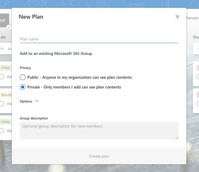 Enter a Plan name in the prompt, choose Privacy setting, optionally enter a Group description if you'd like, and finally click on Create plan. By default, you will only have two columns (called buckets in Microsoft Planner) To do and Add new bucket. You can dump all tasks in the To do bucket, and create other buckets like In Progress and Completed.