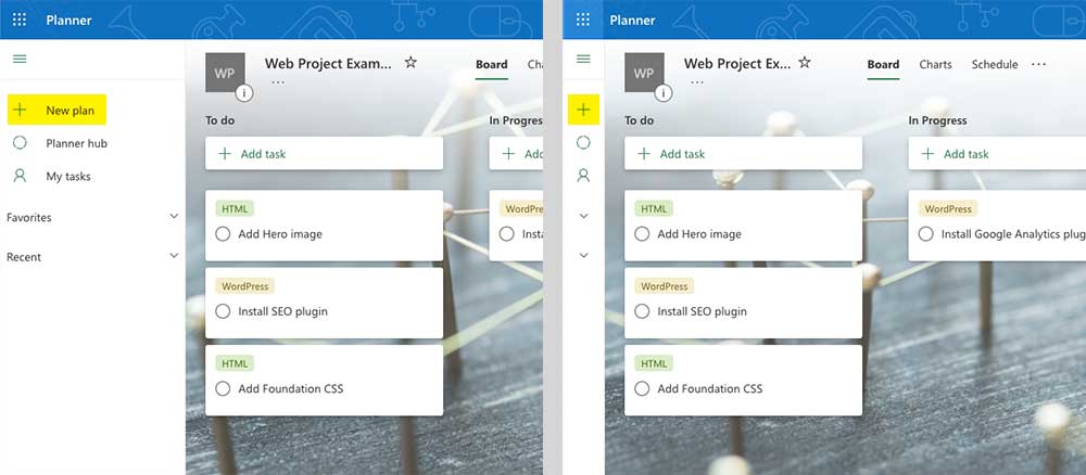 Kanban are comprised of boards and cards. Boards can be thought of as one project, and cards are all the tasks involved. Microsoft Planner refers to their boards as Plans. To start a new plan, click on "New plan" to the left. Smaller browser widths may only show a + sign, which you can also click. Both are highlighted in yellow below.