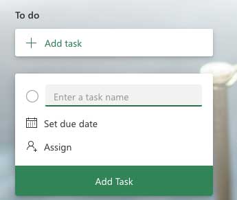 Similar to how Plans are Boards, Microsoft Planner refers to Tasks as cards. To add a new task, you can simply click on Add task under the appropriate bucket. Click on Add Task, enter a name for the task, optionally add a due date and/or assign the task, and finally press enter/return (or click on the Add Task button) to commit the new task. To add more info (or edit), you can double-click on the Task. A popup will appear, in which you can change data as needed.