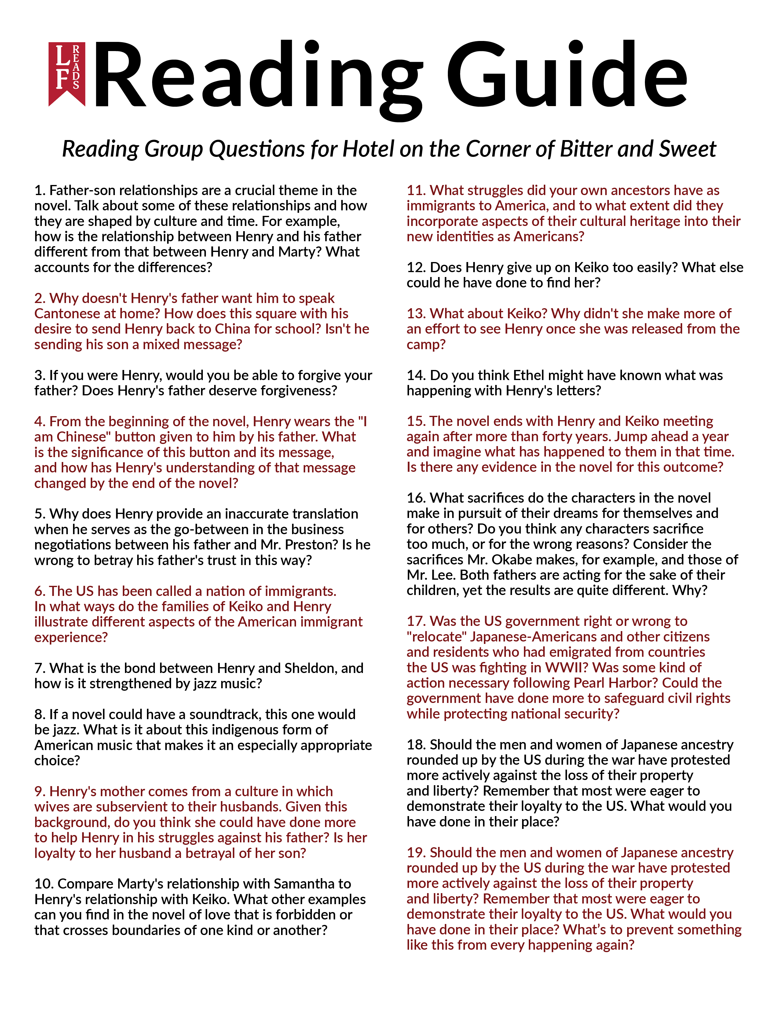 Set during one of the most conflicted and volatile times in American history, "Hotel on the Corner of Bitter and Sweet" is an extraordinary story of commitment and enduring hope. In Henry and Keiko, Jamie Ford has created an unforgettable duo whose story teaches us of the power of forgiveness and the human heart.
