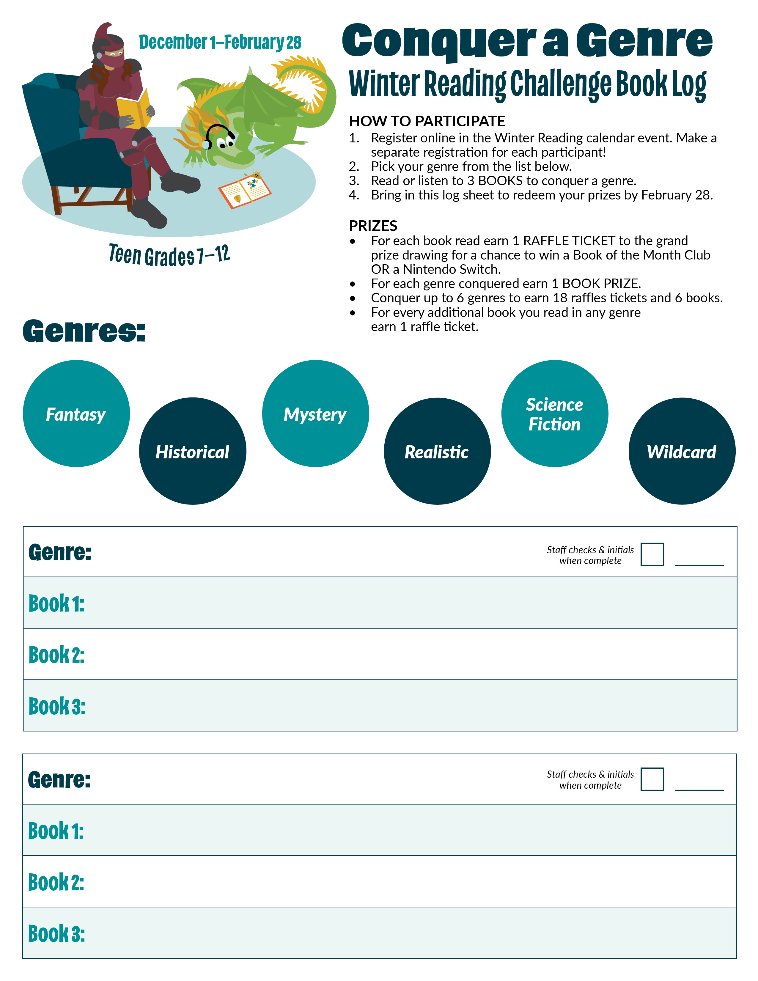 - Download/Print the Book Log PDF for your age group below. Your Book Log includes instructions, a list of genres, and prizes.
