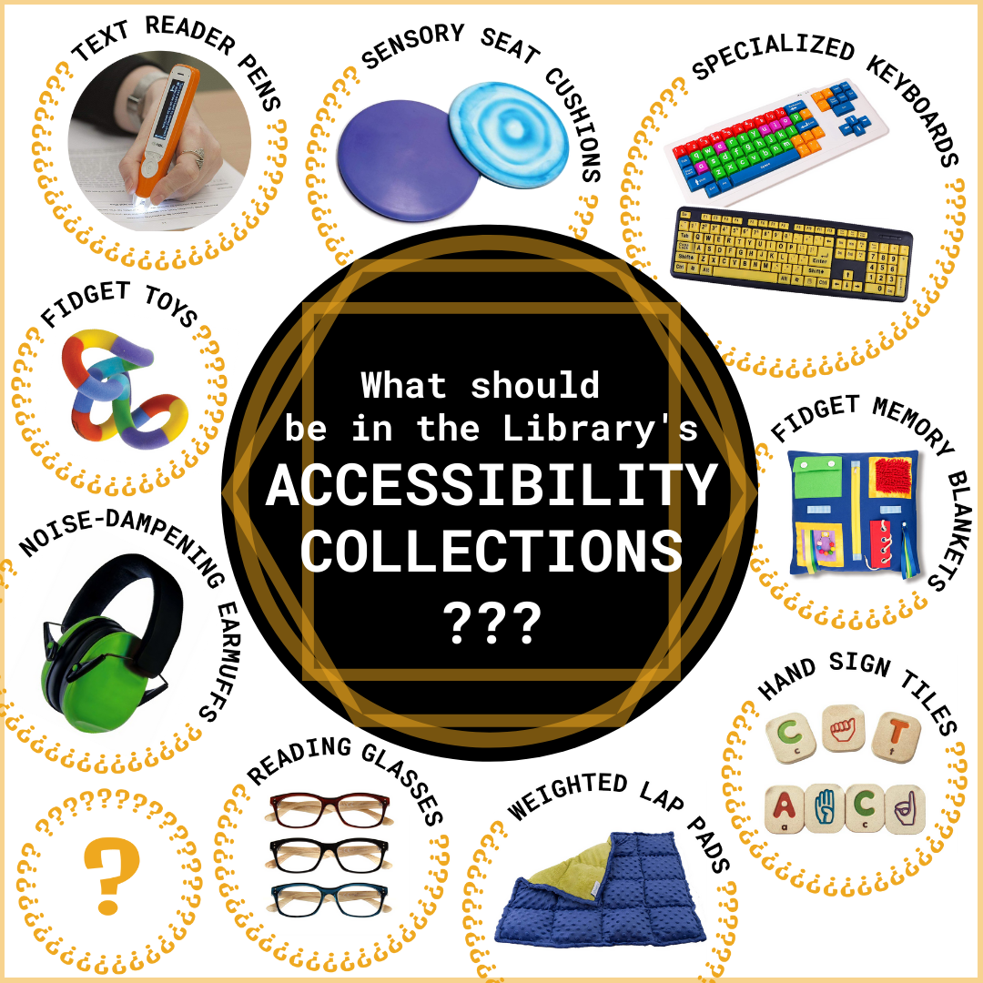 The Accessibility Collections will provide Lake Foresters with items to use and borrow that support motor, social, cognitive, visual, and auditory skill development. The goal is to support Library users of all ages, abilities, and diverse learning and development needs, helping them to be successful in the Library and the community.