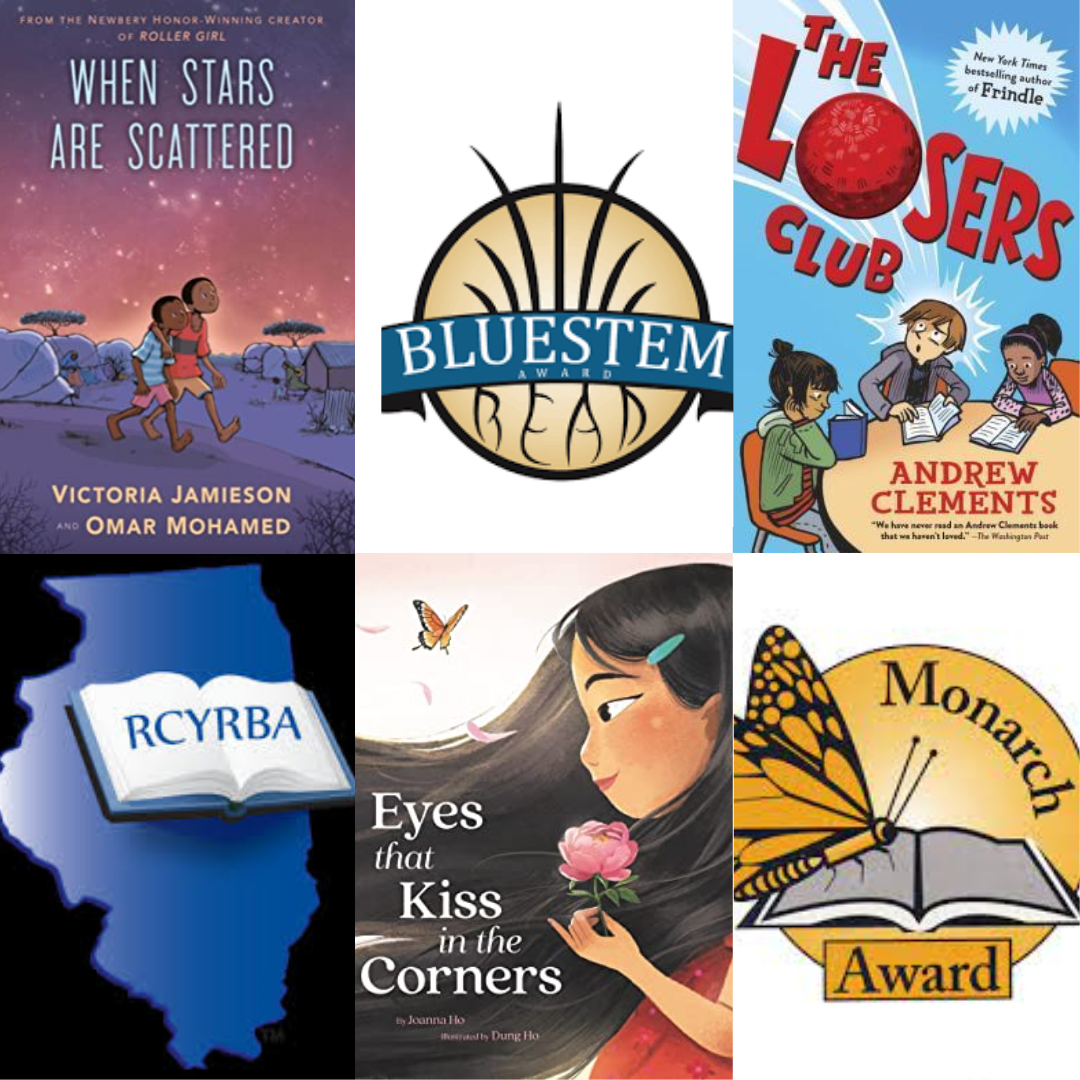 Every school year, about 15 titles are chosen by Illinois educators, teachers and librarians as nominees in 3 different elections: the Caudill Award, voted on by children in grades 5-8, the Bluestem Award by 3-5th graders, and the Monarch Award by K-3 graders. The library keeps extra copies of all these books. A few of the standouts this year are When Stars are Scattered by Victoria Jamieson and Omar Mohamed, Losers Club by Andrew Clements, and Eyes That Kiss in the Corners by Joanna Ho and Dung Ho. But, hey, that's just my opinion. Students have the final say! For a complete annotated list of the nominated titles, try Goodreads: