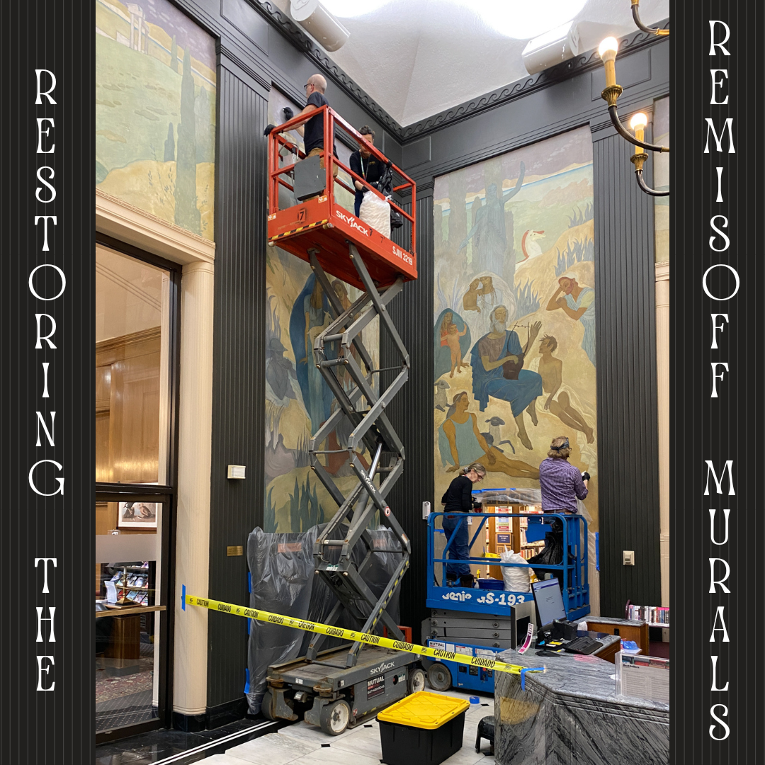 Through a bid process, the Library Board and Staff selected PARMA Conservation to complete the 2024 mural restoration. Parma has conserved hundreds of historic murals in public facilities in 26 states. One member of the PARMA team even participated in the 1997 restoration work.