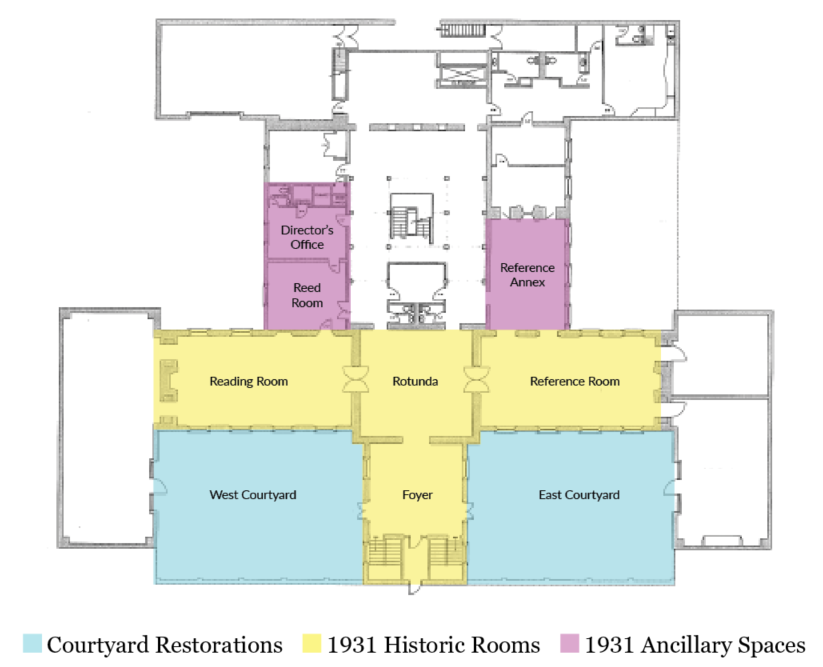 The courtyards, together with the Foyer, Rotunda, Friends Reading Room, and Reference Room, embody the core of original architect Edwin Clark’s vision for the patron experience, and it is logical to revitalize them concurrently. Plans are now kicking off for updates and refurbishment of the interior 1931 historic spaces. The focus of this project will be on new furniture, fixtures, and equipment with improved flexibility of the spaces in mind. A Request for Qualifications was recently posted to begin forming a team of experts.