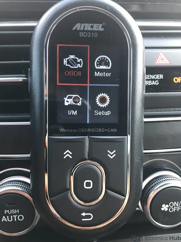 As the device gets its power from the OBD2 Port itself, you don’t have to worry about additional power supply. Once the device is powered on and it boots up, you will get a screen saying “Bluetooth Mode” and “Please download ANCEL app”. Don’t worry. You can use the device even without the app. For this, you have to press the “Mode” button on the left of the device. As soon as you press the mode button, we will get the main display with four icons (OBDII, Meter, I/M, and Setup).