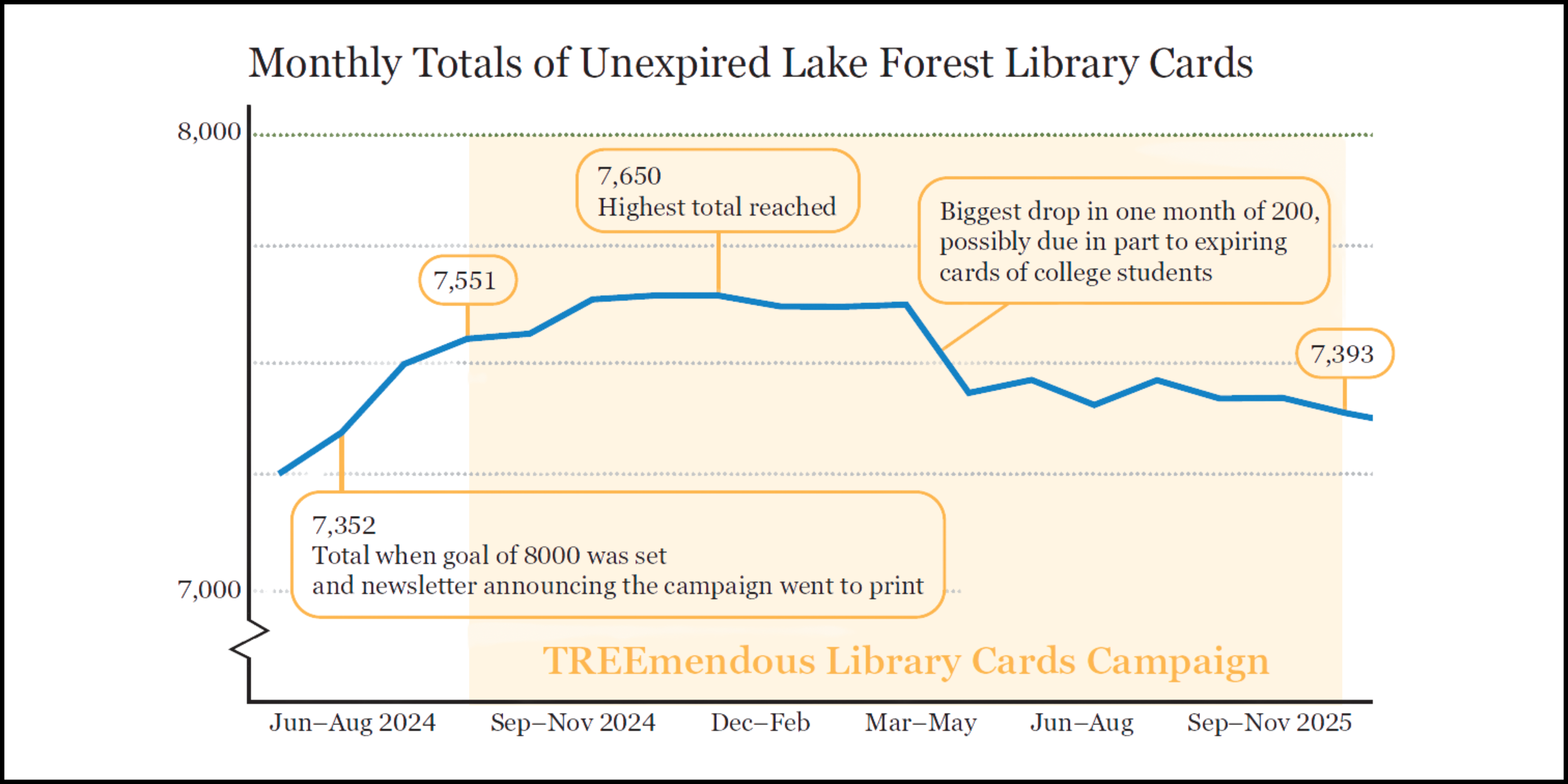The goal of the TREEmendous Library Cards campaign was for 10% more Lake Foresters to get and use library cards by December 2025. That means that out of approximately 19,000 residents, we would have climbed from 7,300 (the July 2024 total at the time the newsletter went to press) to 8,000 cardholders.