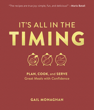 It's All in the Timing: Plan, Cook, and Serve Great Meals with Confidence by Gail Monaghan. It's All in the Timing teaches readers the how-tos of its recipes. Uniquely, it also shares the when-tos by organizing the recipes into more than 20 well-crafted menus. Culled from Monaghan's more than 30 years of home entertaining and culinary instruction, this book demystifies the preparation of each menu, treating the entire meal as an extended recipe. The book offers tips for meals that range from the modest and basic to the elaborate. From the simple luncheon to the grand holiday dinner, each menu begins with an Order of Preparations list—a snapshot of what to make, when to make it, and how to avoid common problems, ensuring your meal unfolds like clockwork.