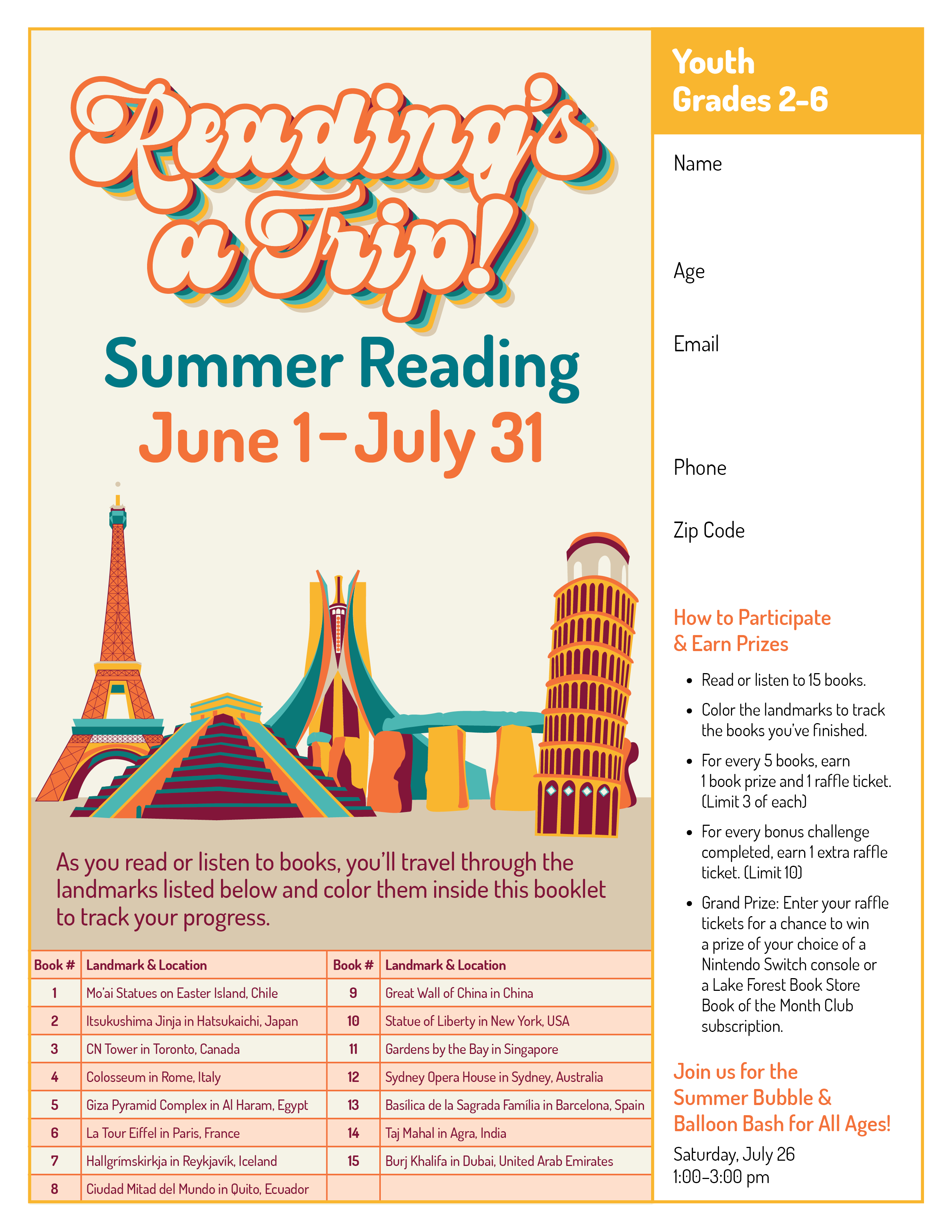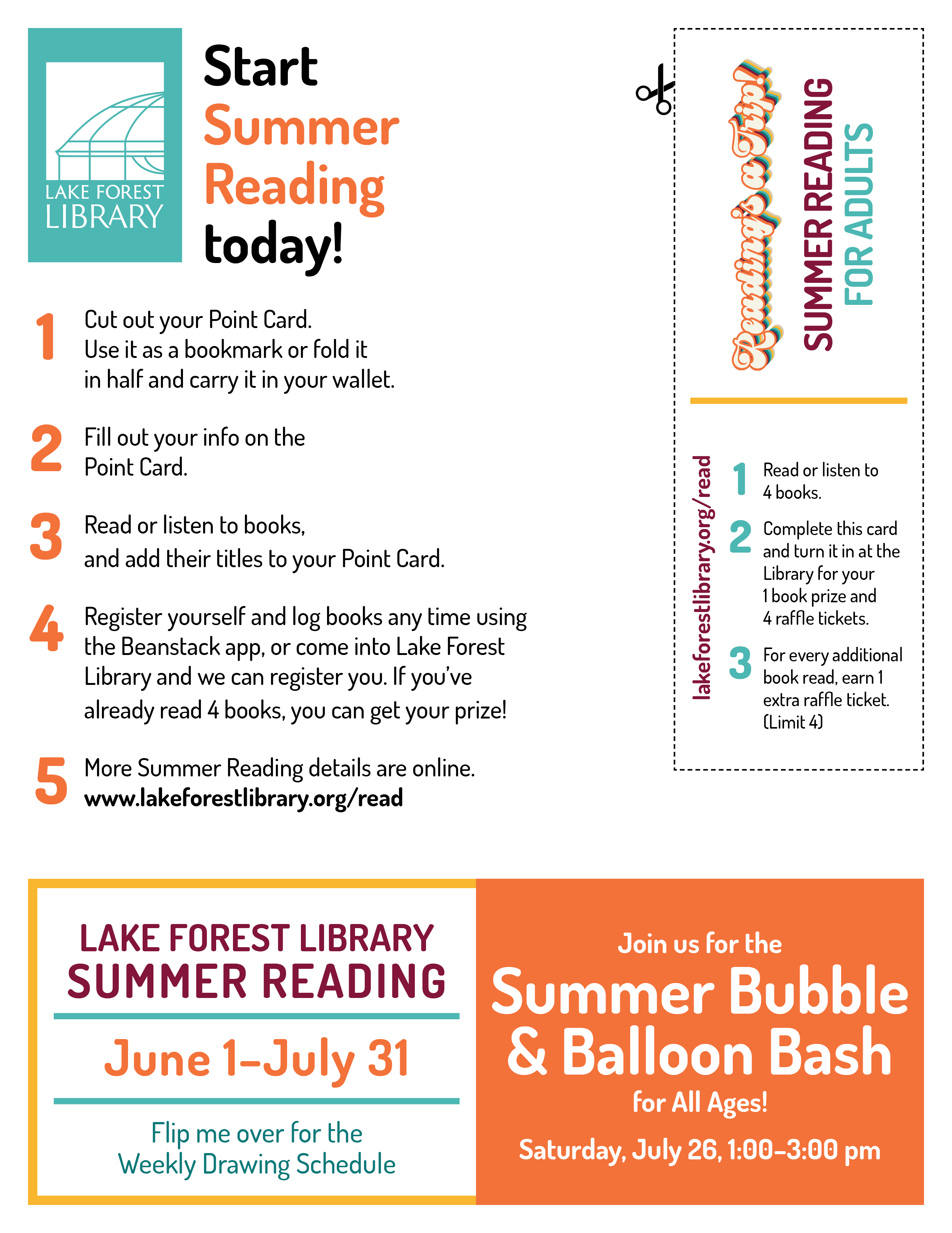 - 🏆 Grand Prize: If you complete the program by reading 4 books, all of your raffle tickets from the weekly drawings are automatically re-entered for a chance to win a Lake Forest Book Store "Book of the Month Club" subscription.