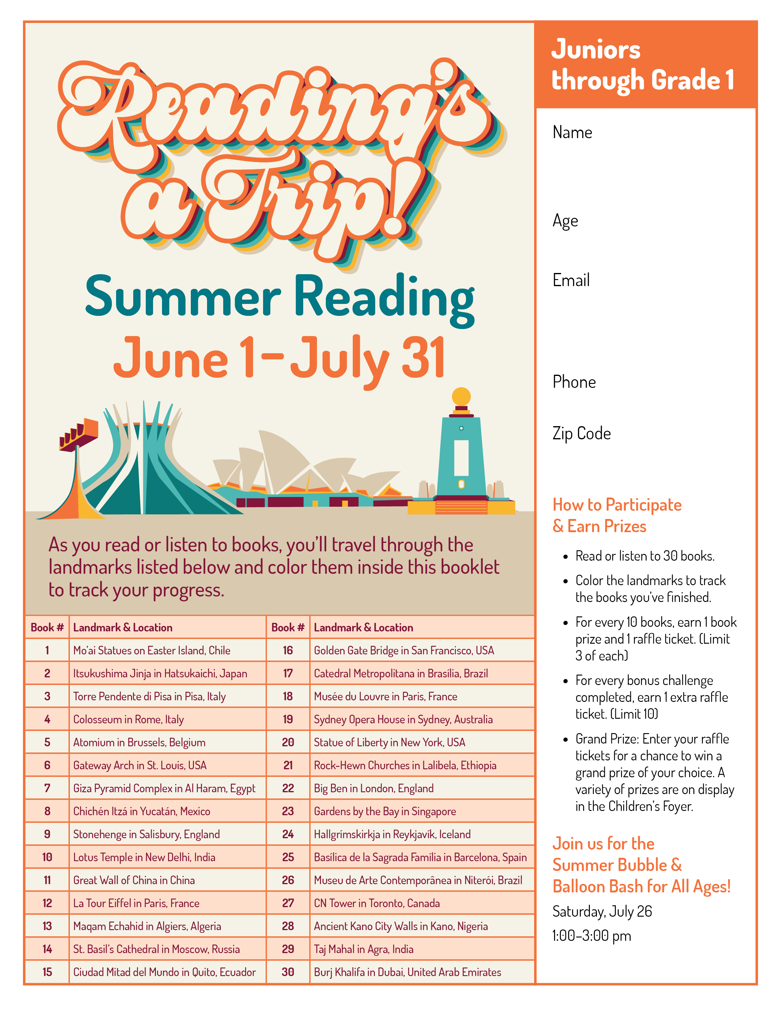 From bookmarks to landmarks, travel and read around the world this summer! Summer Reading is a great way to build and reward reading habits. Join us for good books and fabulous prizes.